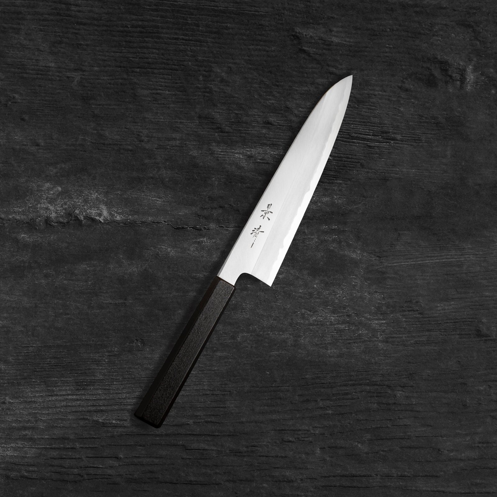 The Gyuto is a versatile kitchen knife with a slim blade and a pointed tip. The tip makes it easy to cut precisely and is great for slicing meat and fish. The slight curve of the blade lets you cut smoothly with less effort.
